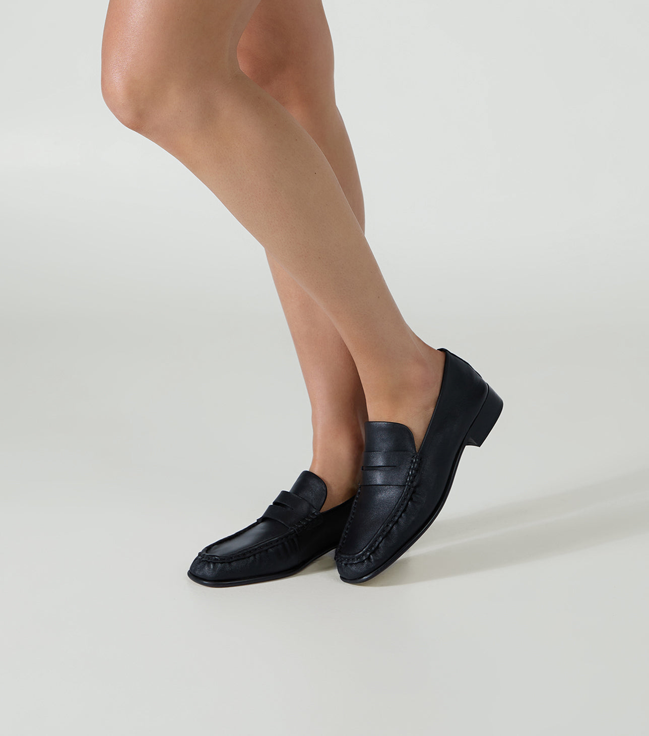 Make the Gomez loafer your new power piece. Crafted in black leather, this flat is a luxurious everyday wardrobe essential, boasting a sleek penny loafer design, scrunch detailing and a durable, comfortable flat heel. It's the stylish statement that instantly elevates your casual look, making it ideal for the office or adding polish to a weekend outfit.