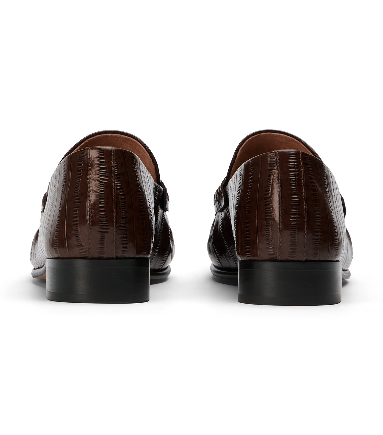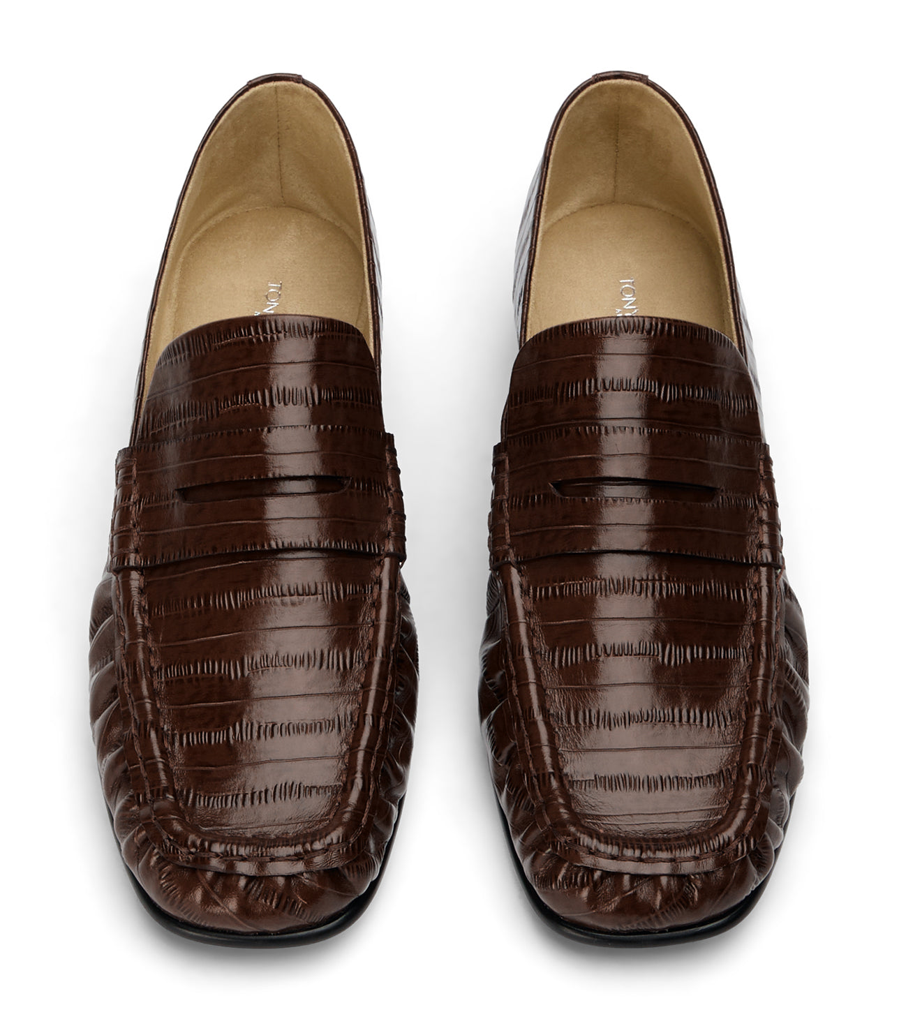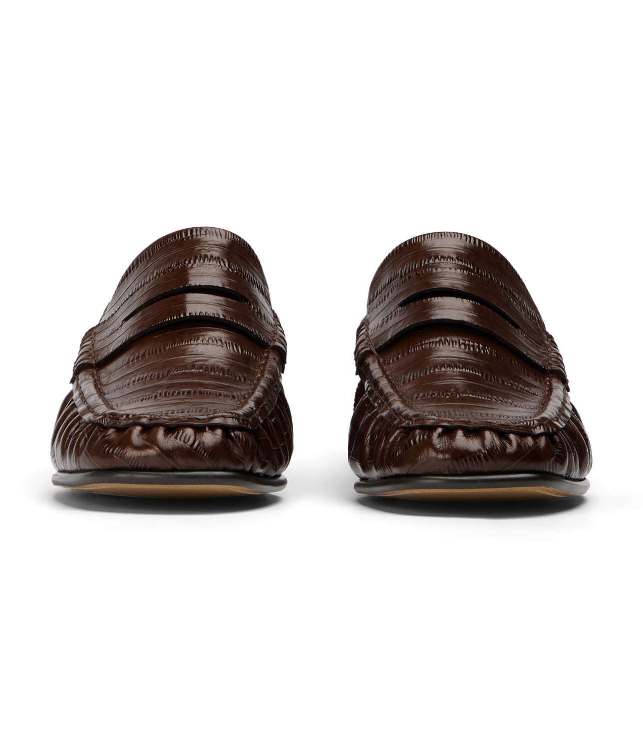 Make the Gomez loafer your new power piece. Crafted in brown embossed leather, this flat is a luxurious everyday wardrobe essential, boasting a sleek penny loafer design, scrunch detailing and a durable, comfortable flat heel. It's the stylish statement that instantly elevates your casual look, making it ideal for the office or adding polish to a weekend outfit.