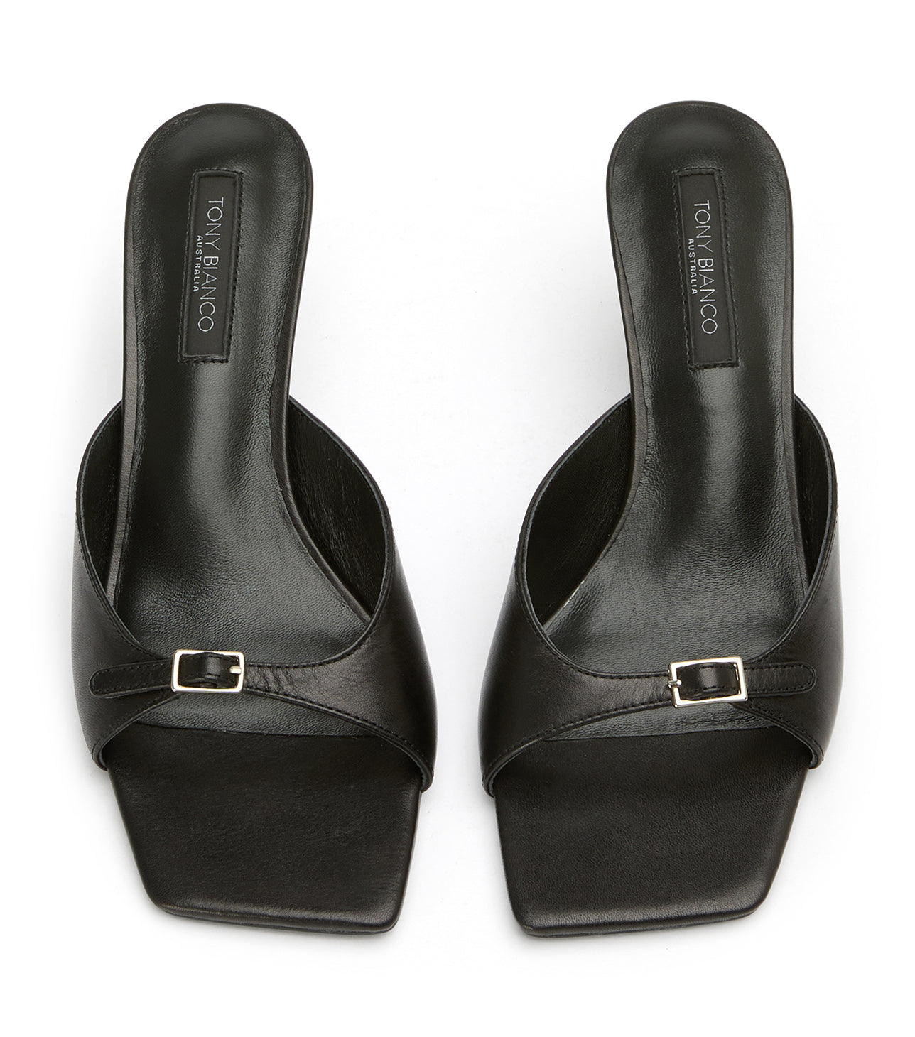 Refined and understated, Rada is a low mule heel with an open square toe and subtle buckle detail. A modern essential with effortless polish.