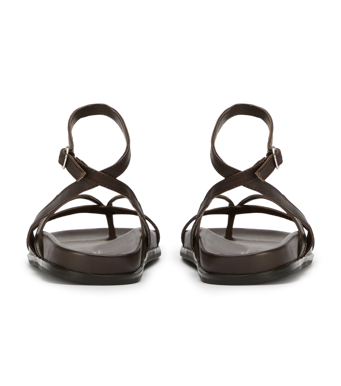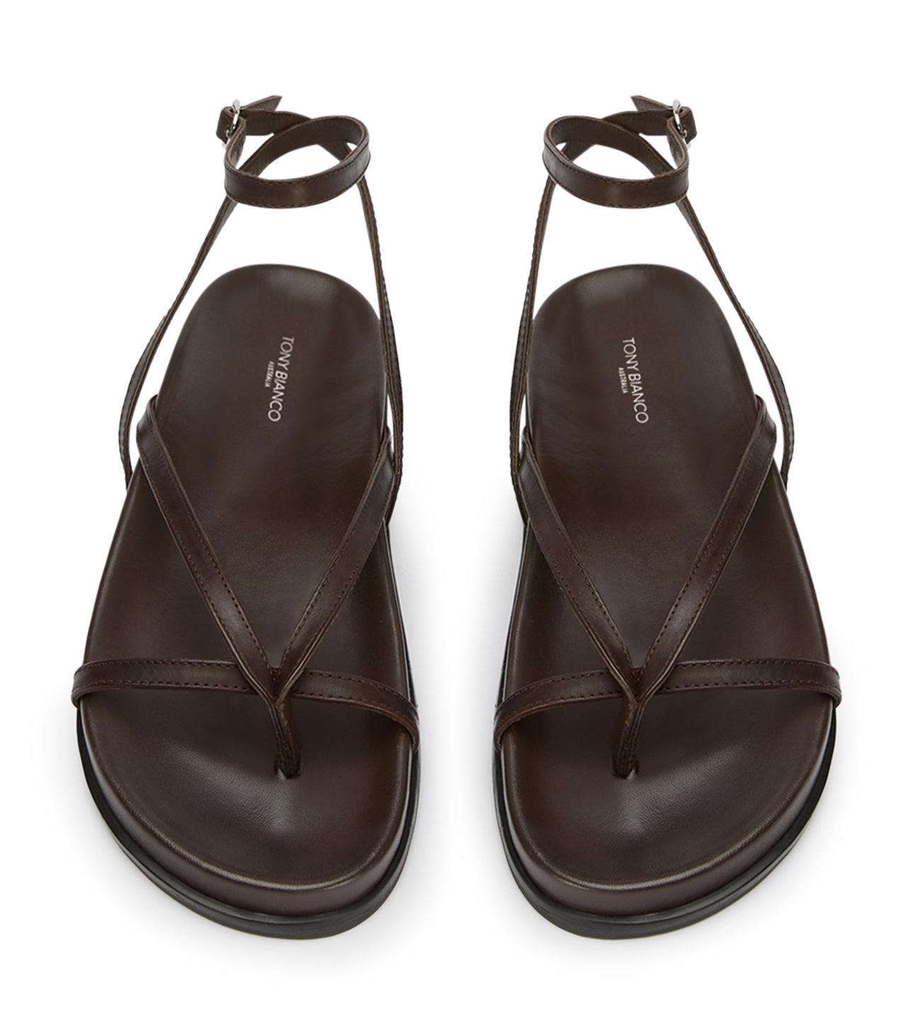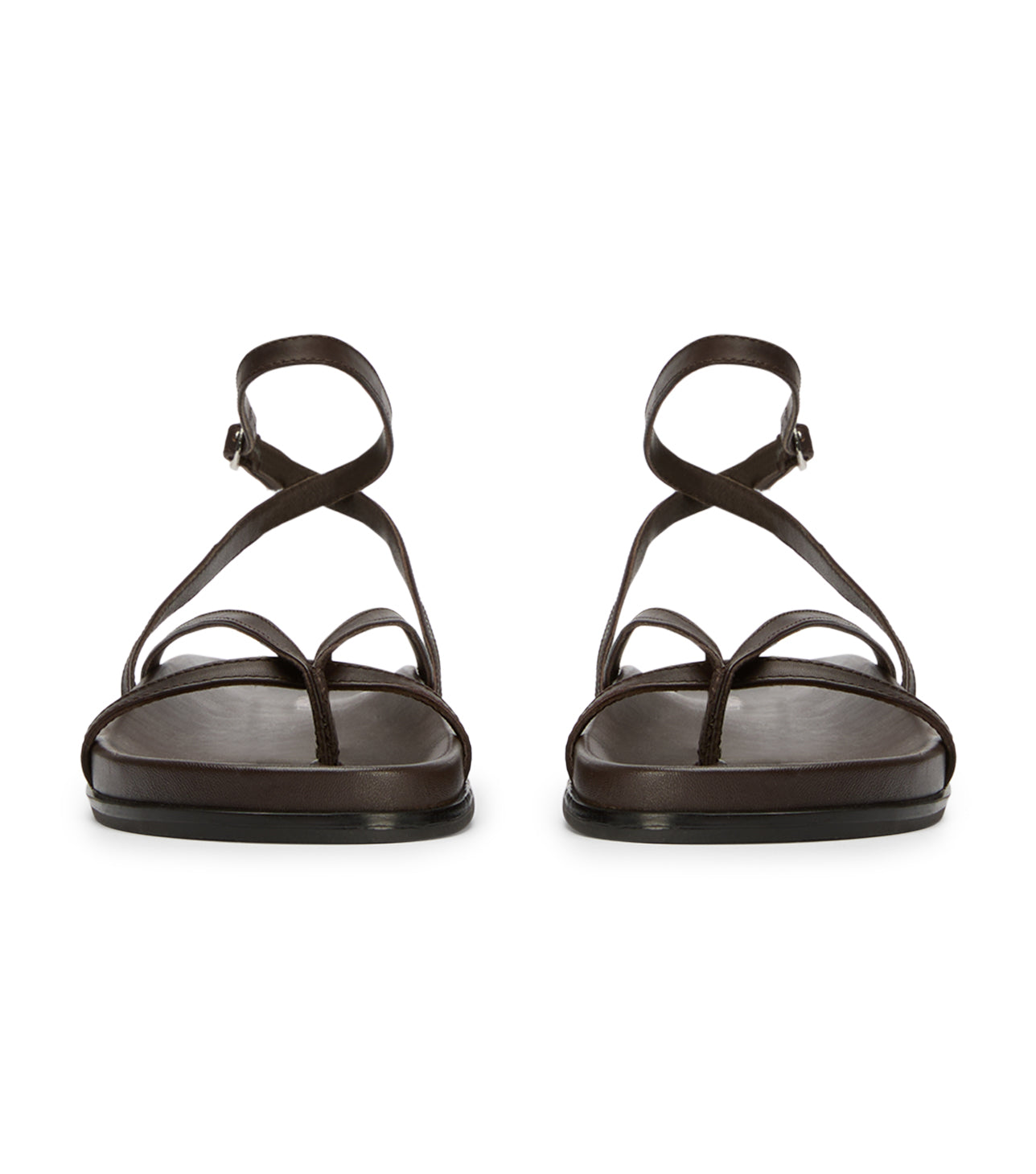 We're leaning on the choc Lucie sandal this season for the cool-girl effect. Donning a wide foot-bed, plush leather lining, woven upper and wrap-around ankle strap, this is the ultimate summer sandal.