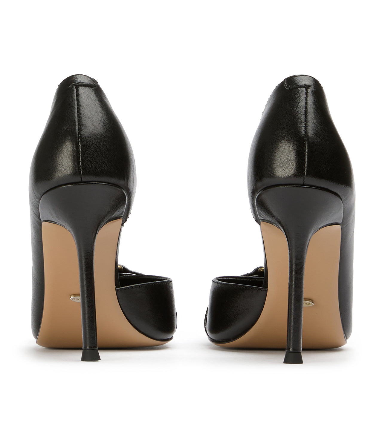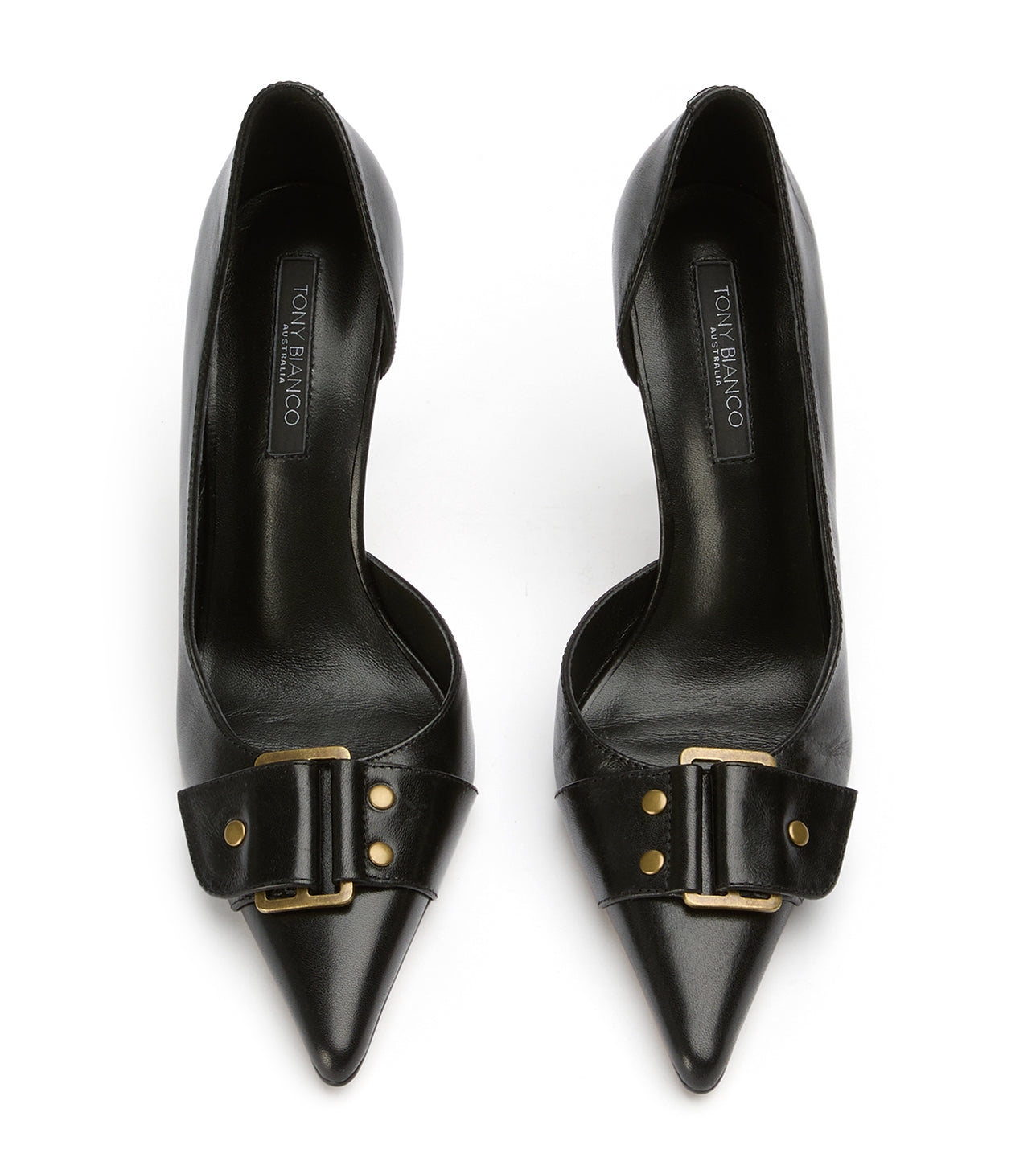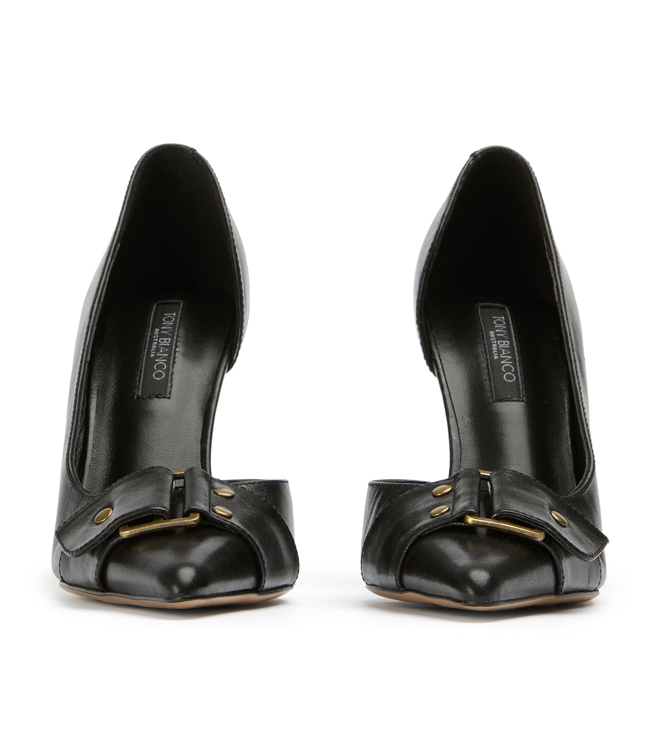 Make an impactful entrance with the striking Nexa heel. Embodying an edgy sophistication, this high heel is a stylish wardrobe essential, boasting a sleek shape with cut-out sides that elegantly expose the arch and a sharp pointed toe accented by a bold front buckle strap. It’s the perfect blend of classic elegance and modern attitude, securing its place as your go-to statement shoe.