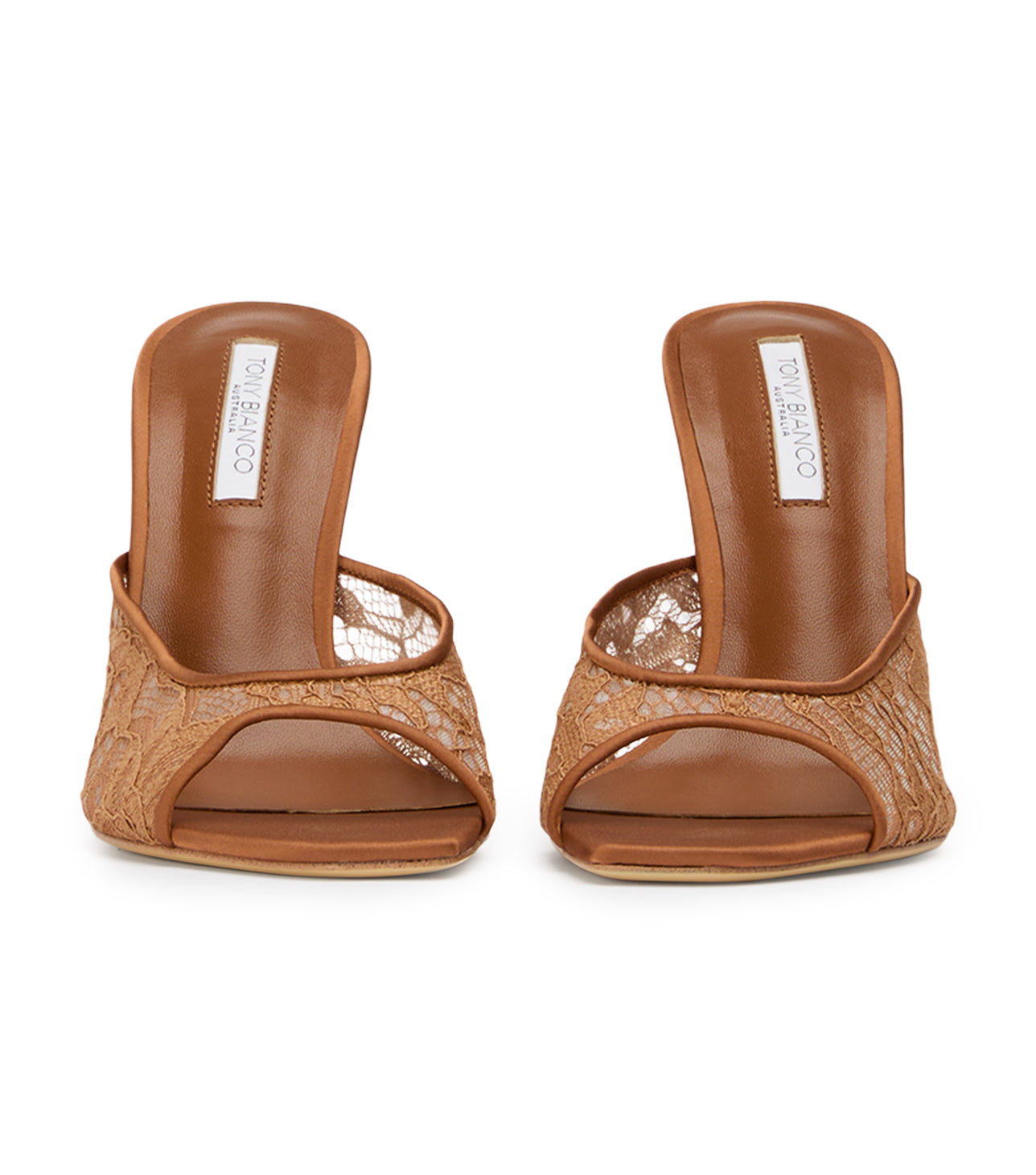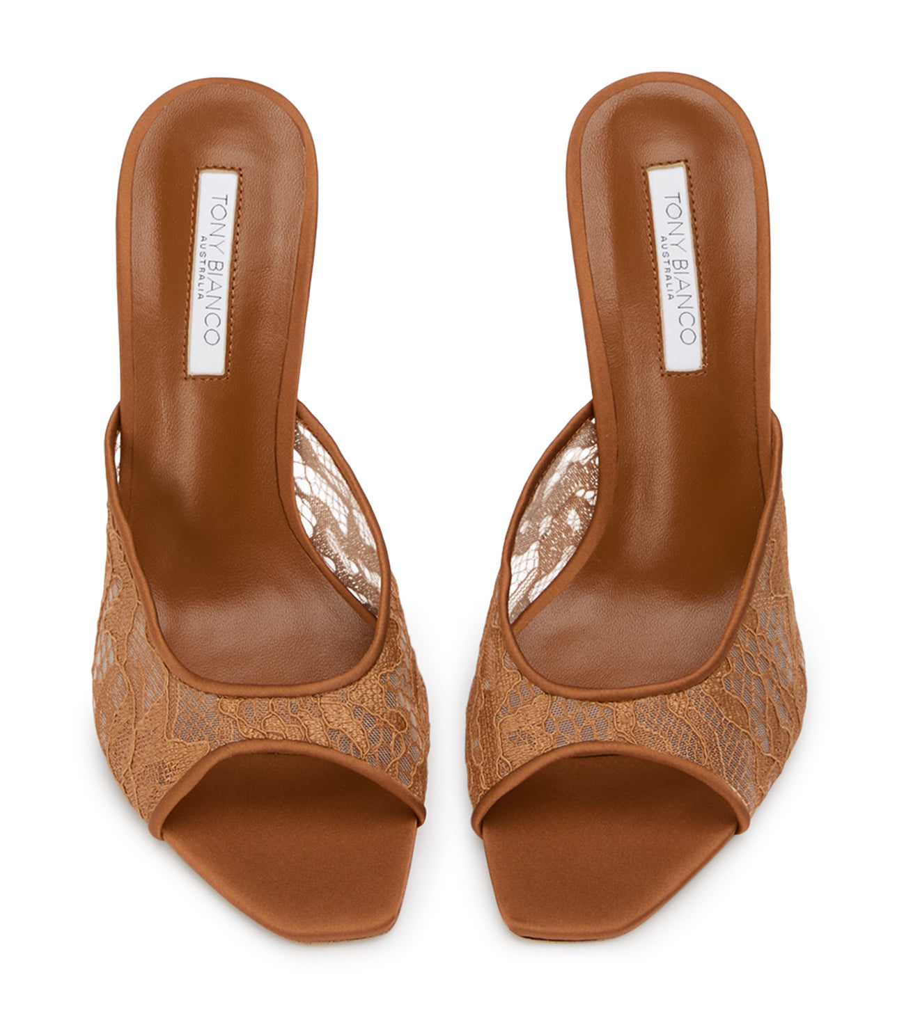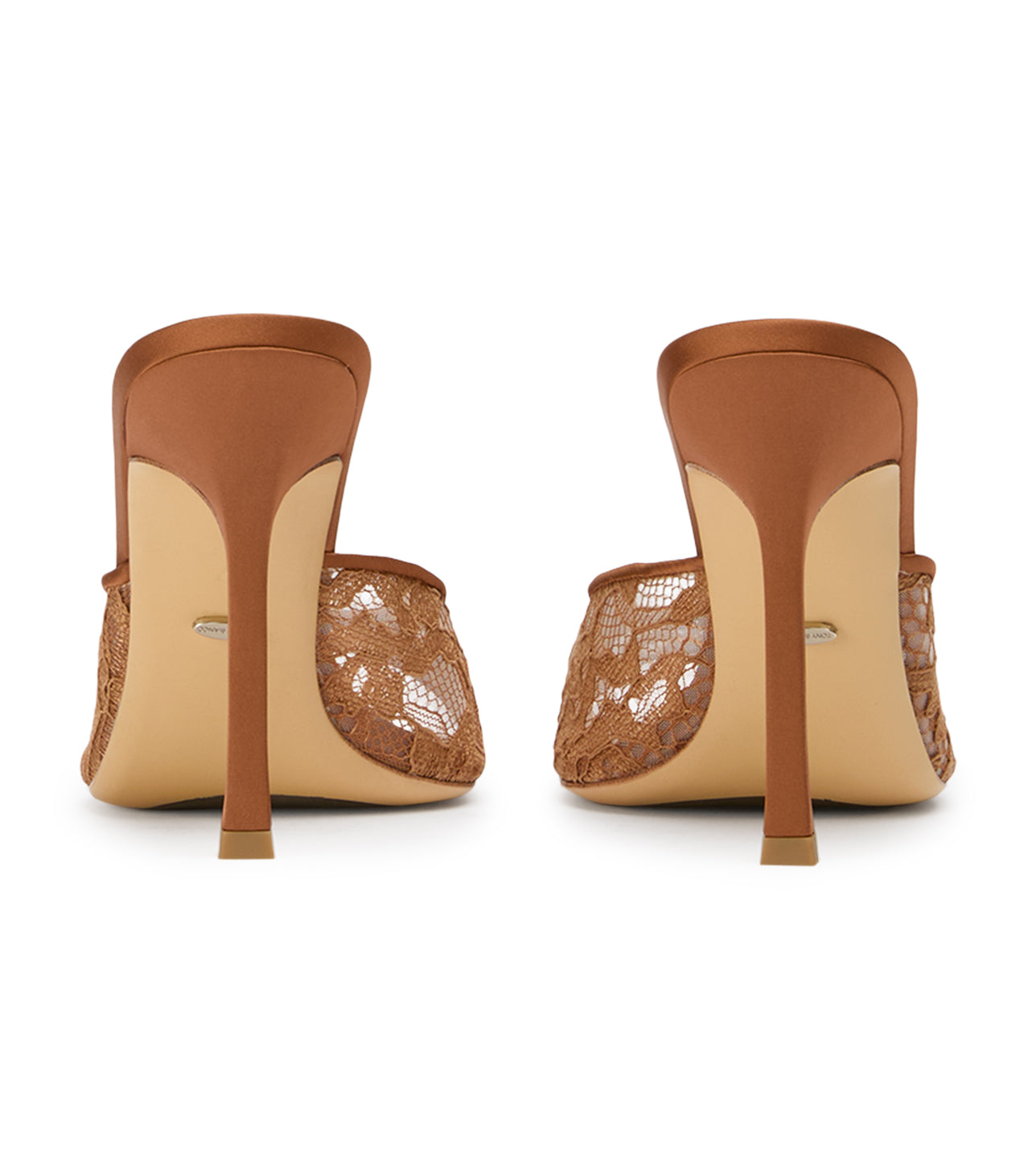 Dashing is a stiletto mule heel with a lace upper that walks the line between soft and sharp. The open-back silhouette keeps it effortless whilst the texture keeps it interesting.