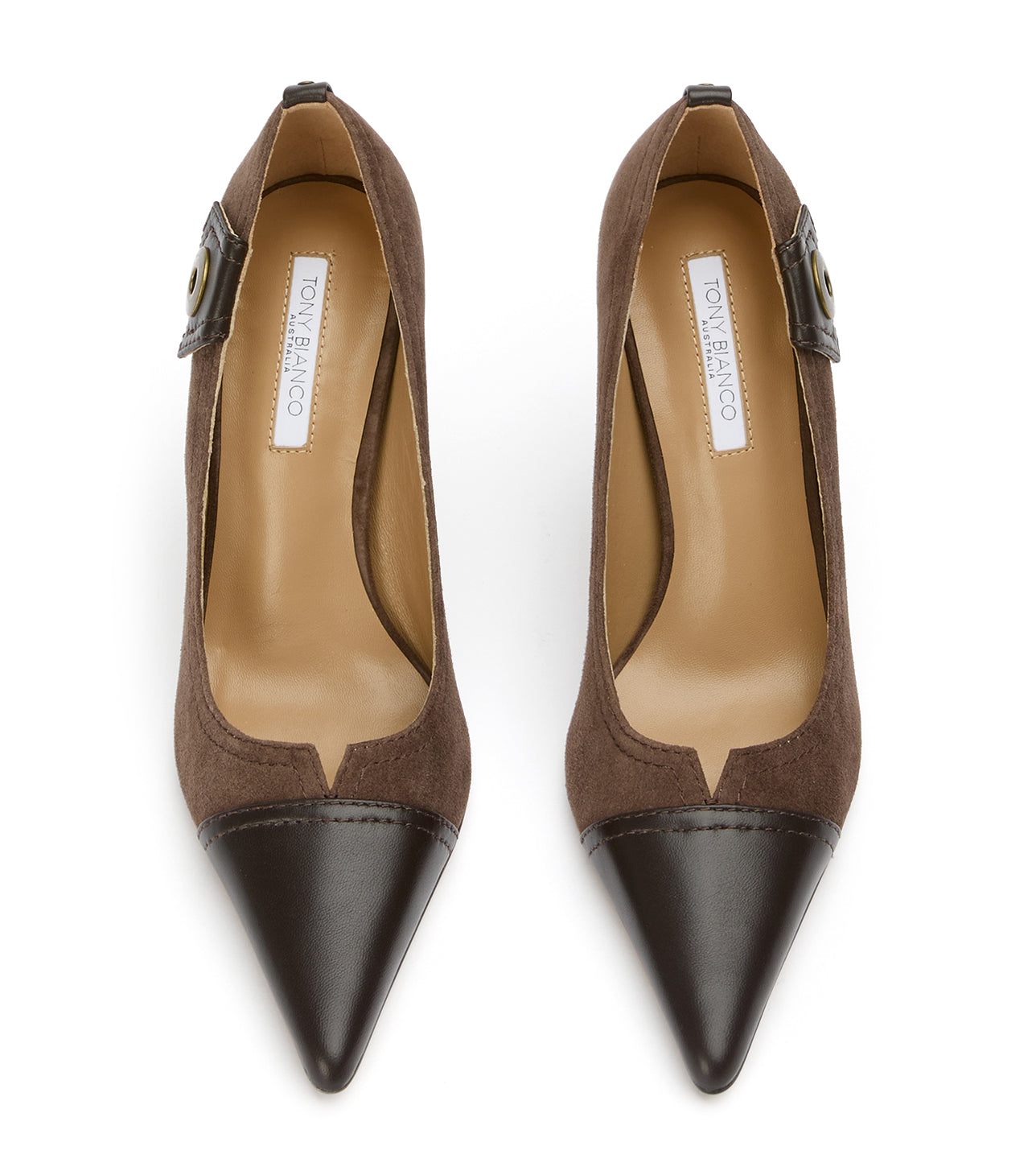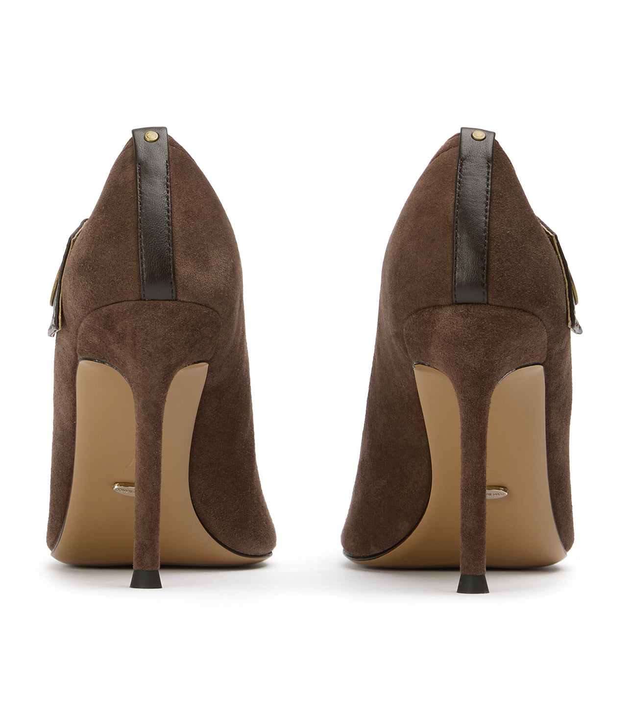 Infuse your evening wardrobe with textured sophistication in Nessa. This striking pointed-toe pump masterfully blends classic glamour with edgy modern hardware, featuring a luxurious brown suede body and a sharp leather contrast toe. Set on a soaring stiletto, the Nessa is the definitive brown evening heel for a high-impact, polished finish.