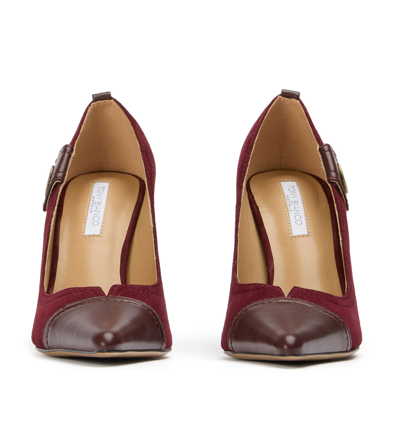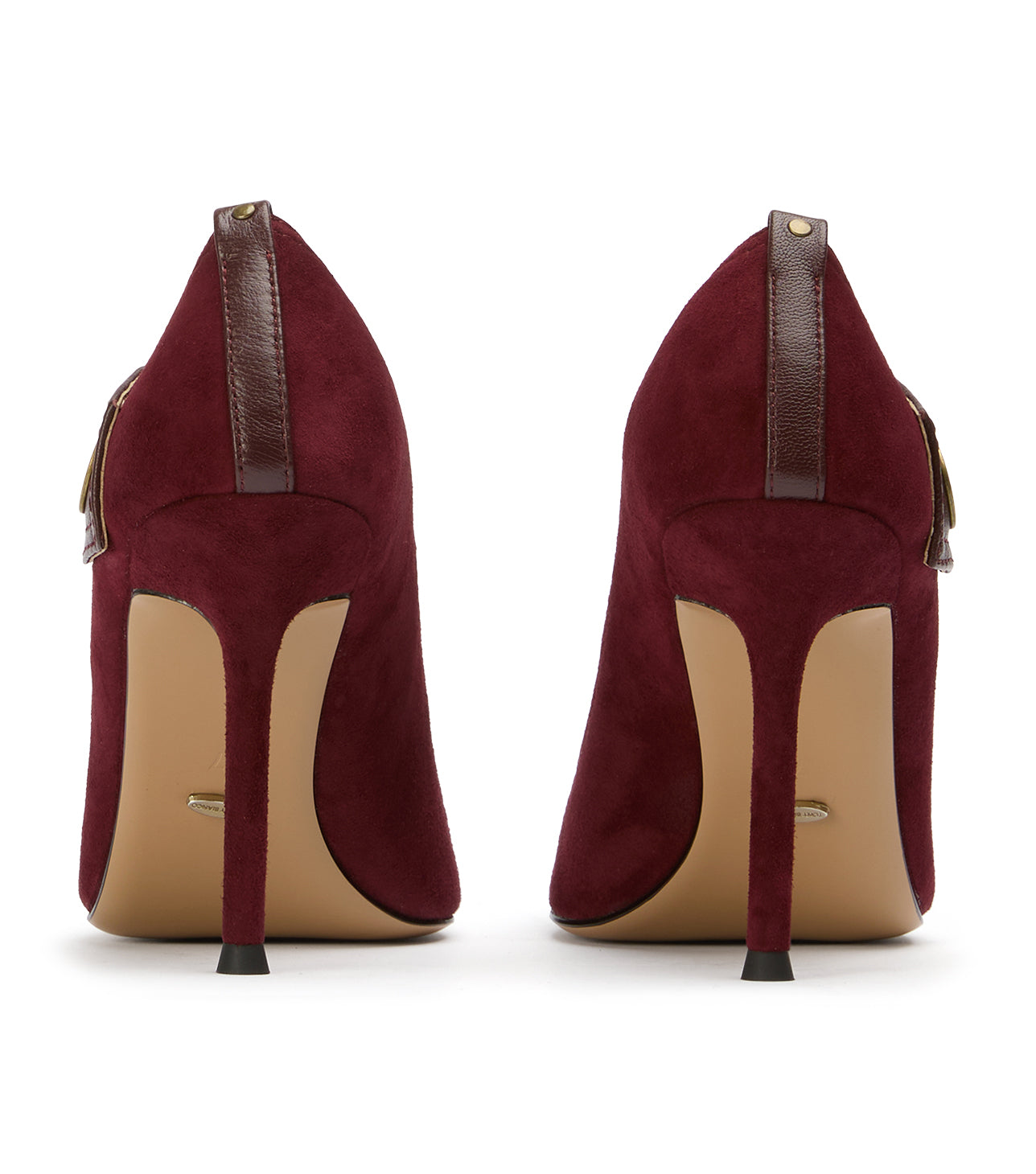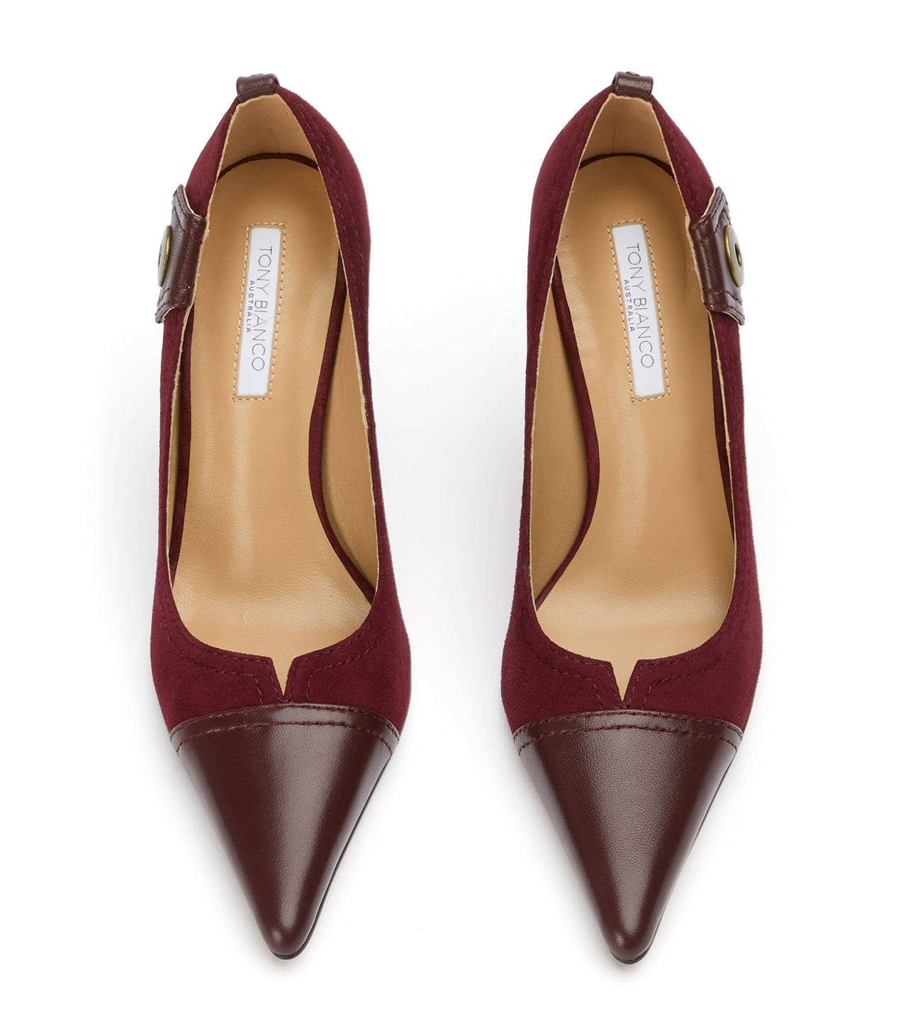 Infuse your evening wardrobe with textured sophistication in Nessa. This striking pointed-toe pump masterfully blends classic glamour with edgy modern hardware, featuring a luxurious red suede body and a sharp leather contrast toe. Set on a soaring stiletto, the Nessa is the definitive red evening heel for a high-impact, polished finish.