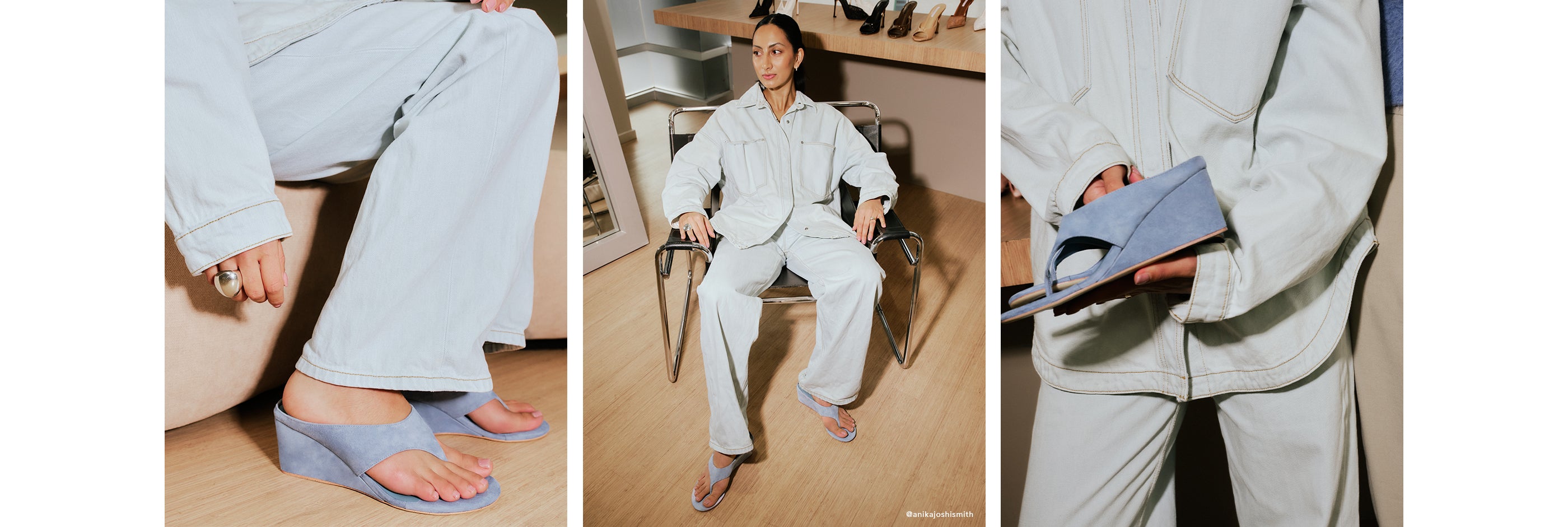 Anika reimagined her go-to silhouette with a modern edge: SWIFT in Denim Suede. Her cool-girl wedges balance ease and attitude, bringing personality into every step. The result is a statement pair that elevates any outfit with effortless style.