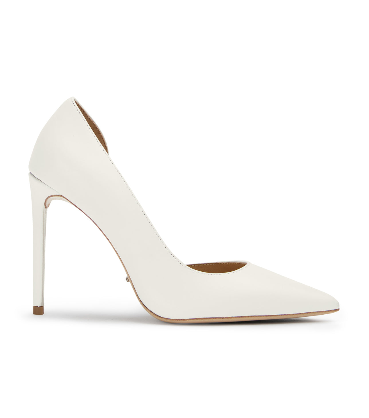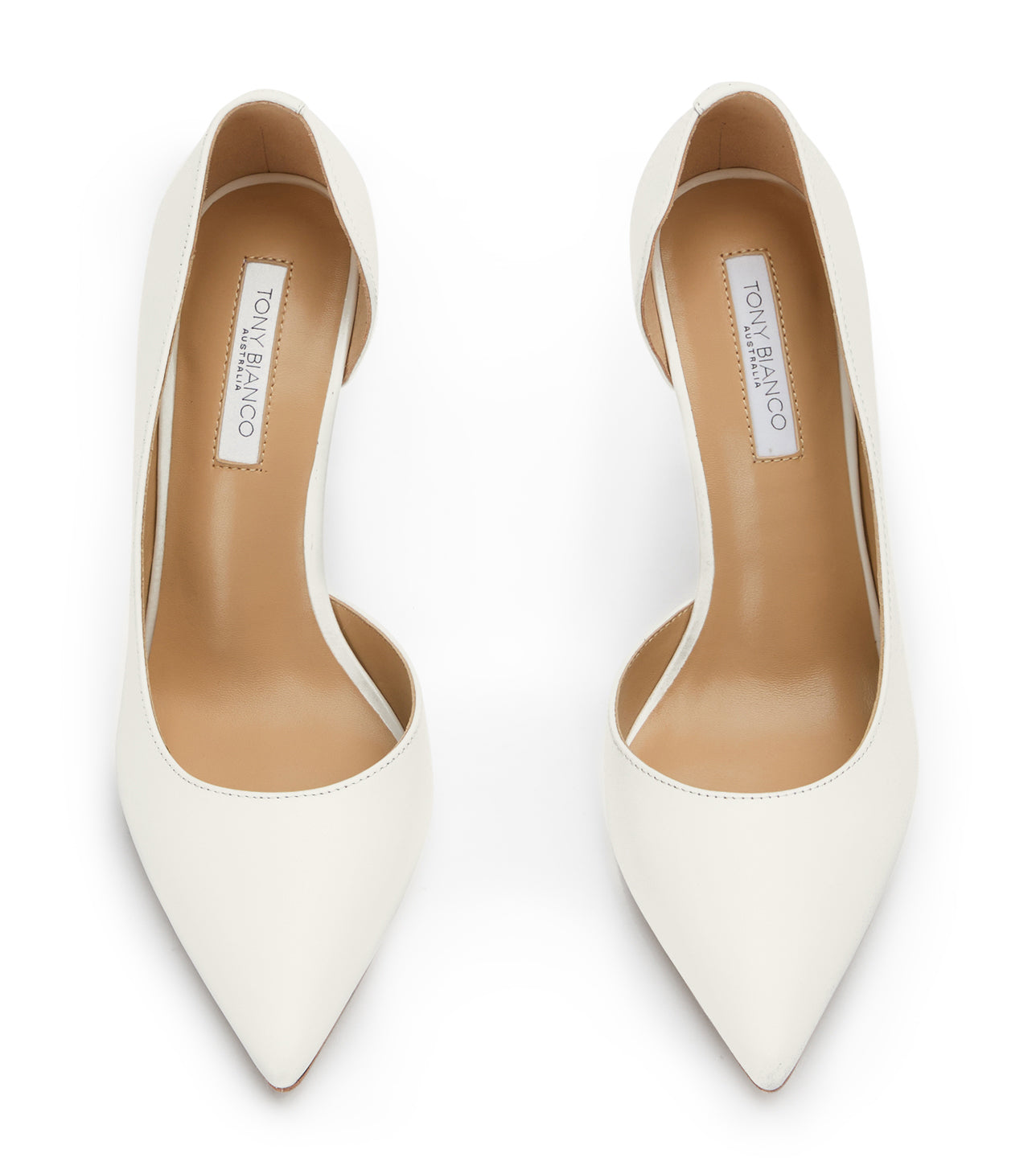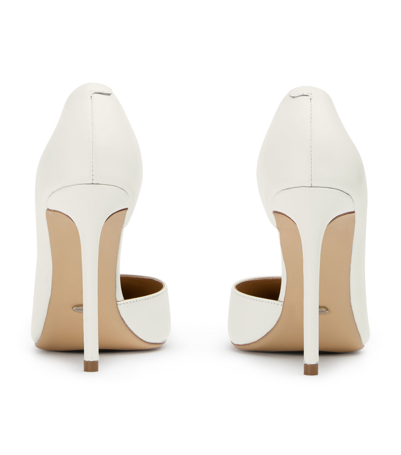 For a court shoe that exudes femininity look no further than the Alyx white stiletto heel. Showcasing a perfectly pointed toe-shape, these white pump shoes are designed with an ultra high stiletto heel, a curved vamp and is finished with a creamy white hue. Pair with fitted pants and a blazer for a corporate work shoe option.