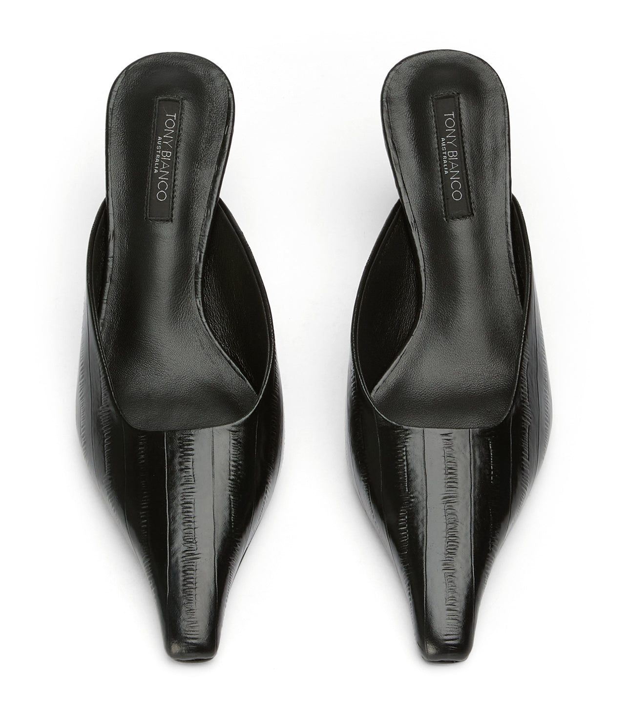 Unlock effortless sophistication with Juniper, a striking pointed-toe mule that prioritises texture and form. This standout slip-on is defined by its unique anguille-textured leather, featuring a ridged, high-shine finish that brings a tactile edge to a classic silhouette. Balanced on a sculptural flared heel, this mule serves as the essential women’s black mule heel for those who demand a blend of modern artistry and everyday ease.