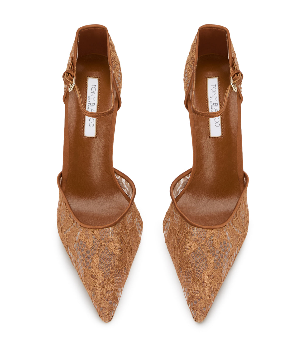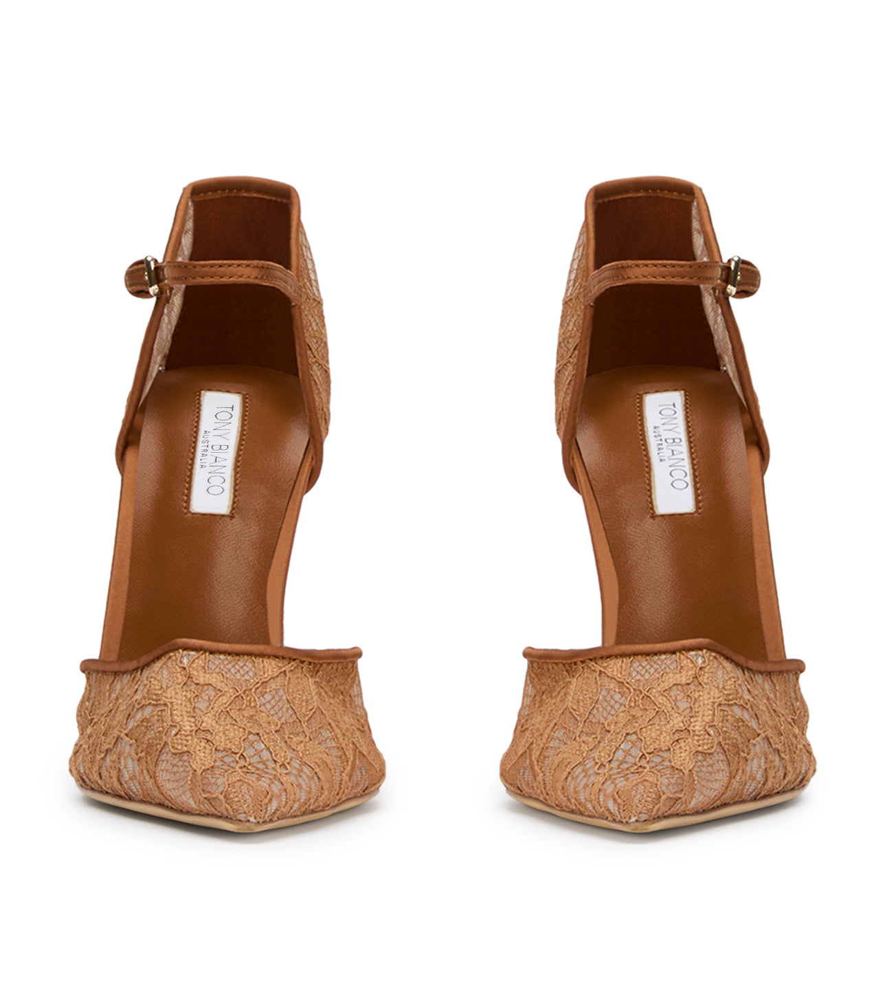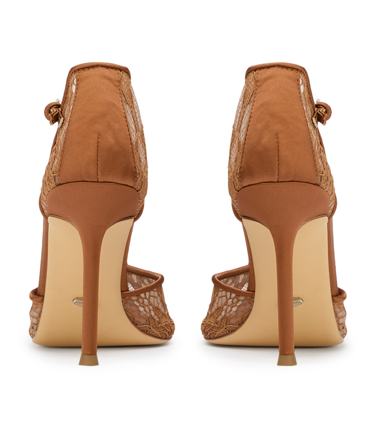 Exuding undeniable allure, these black heels feature a daring mesh/lace structure and a closed pointed toe. Complete with an ankle strap for added support and style, Nina is ready to accompany you to your next event.