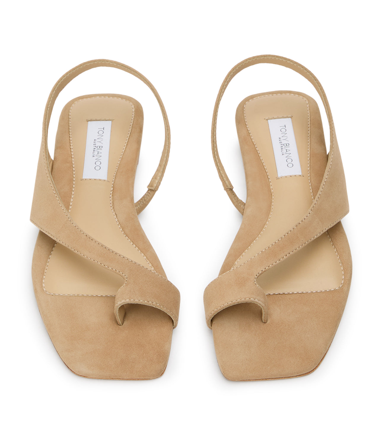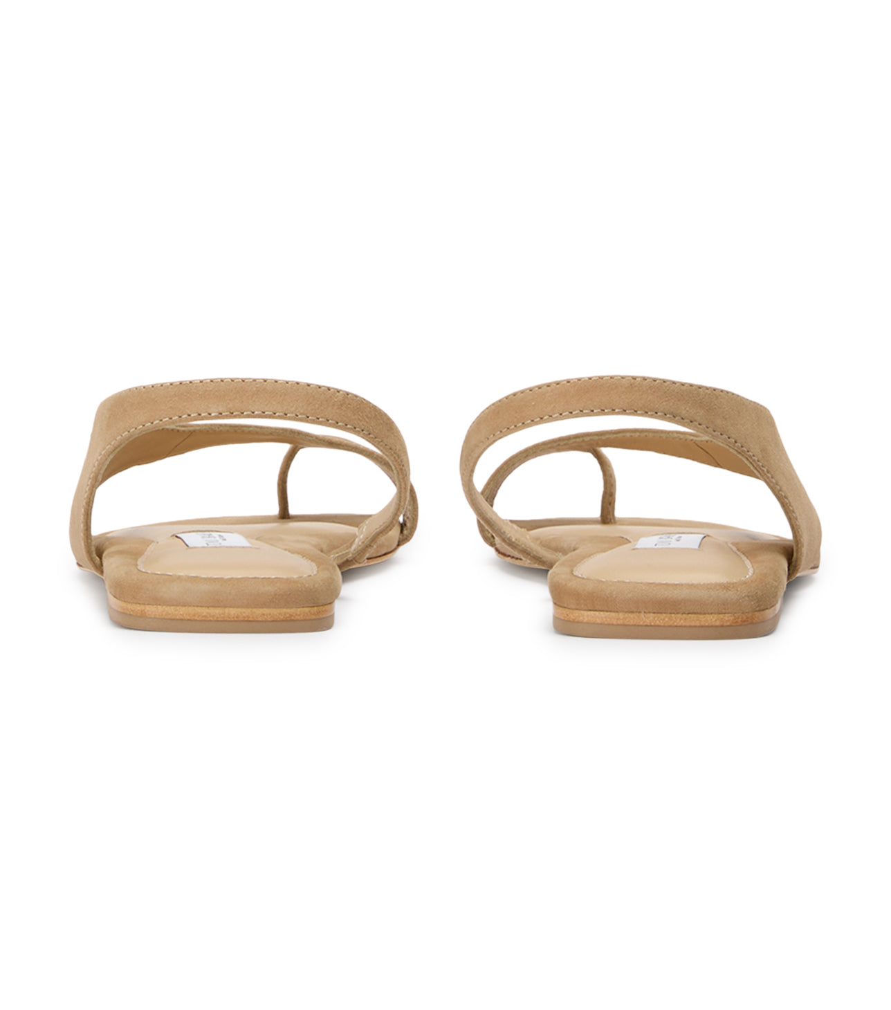Minimal and versatile, Roma is a flat suede leather sling-back sandal featuring a simple toe strap. A refined silhouette designed for easy, everyday wear.