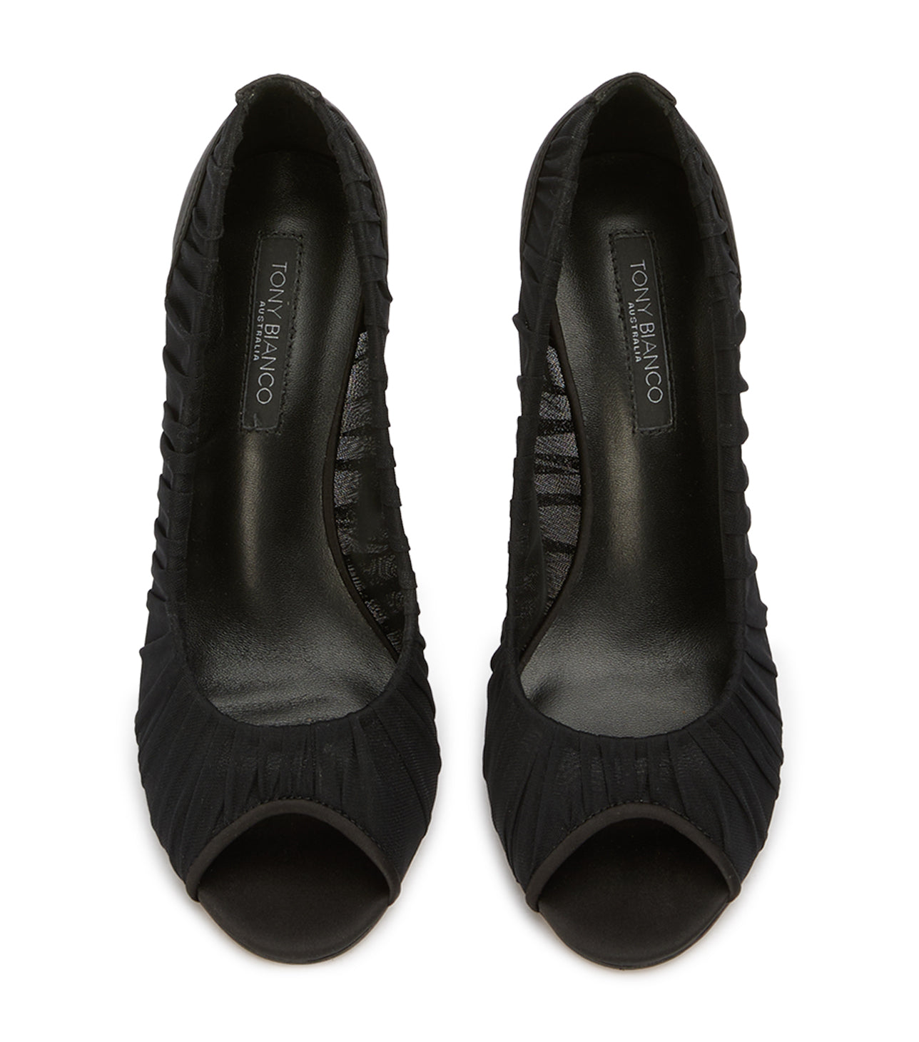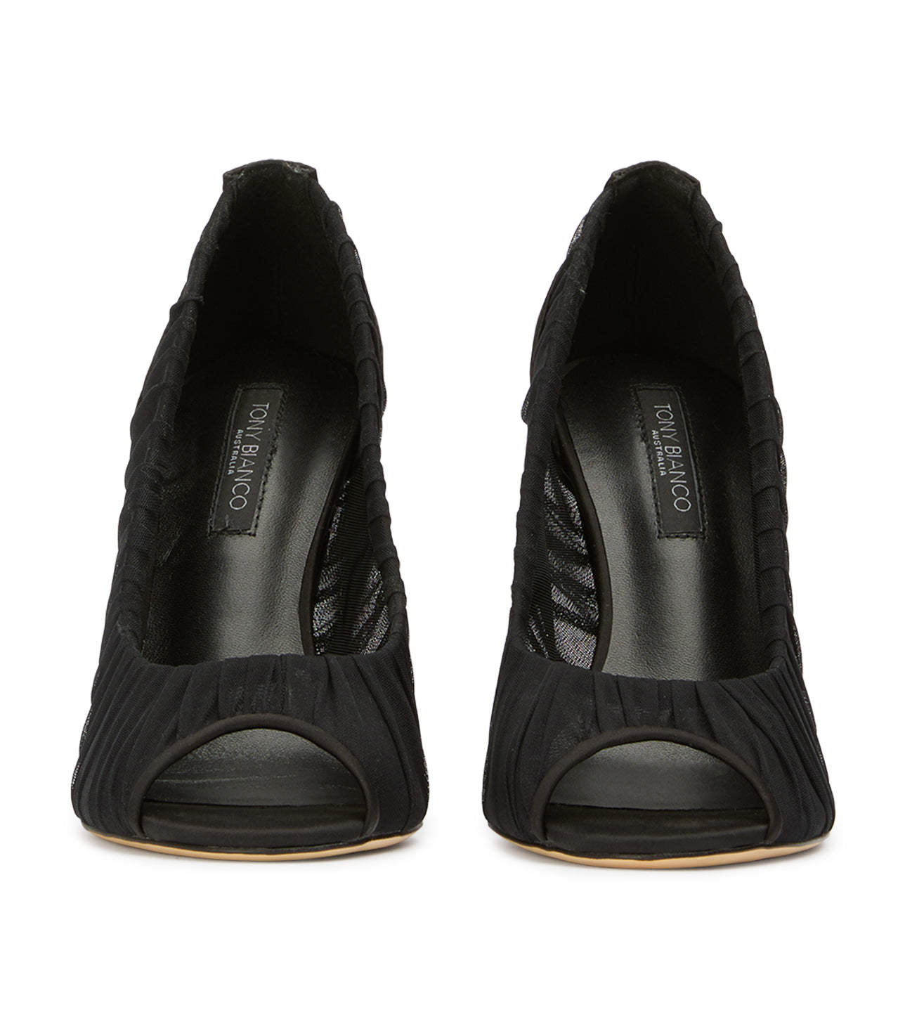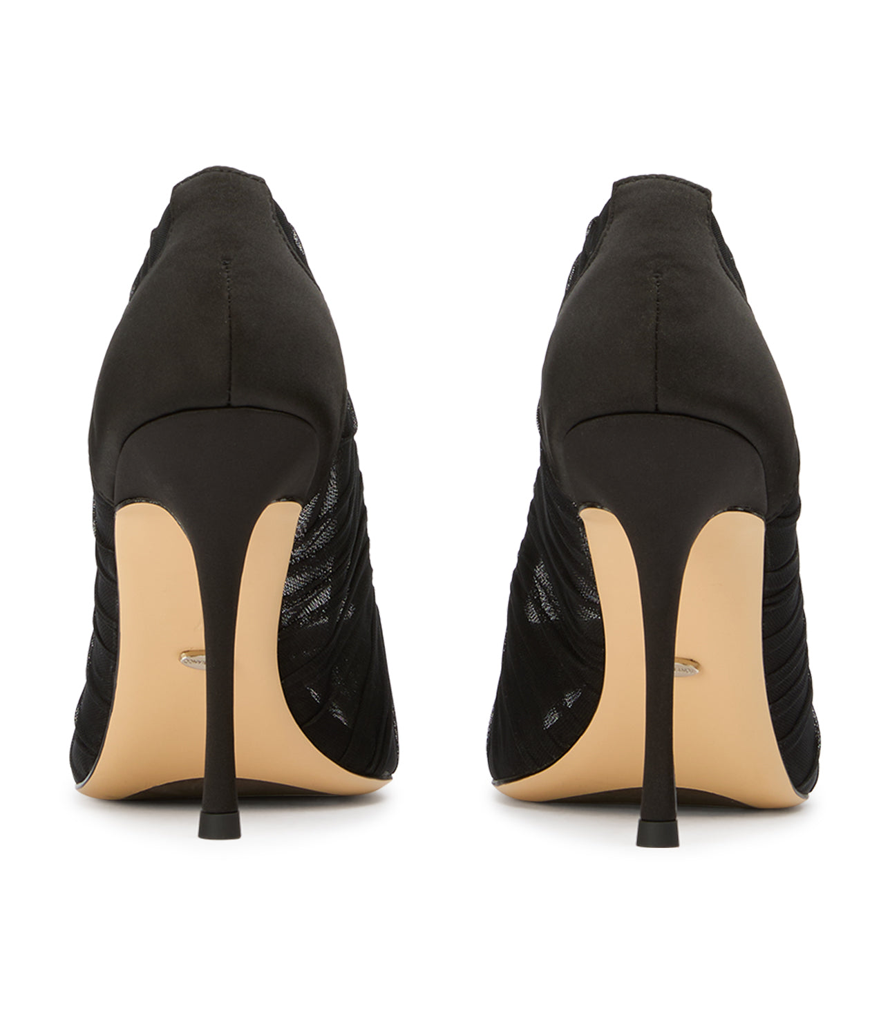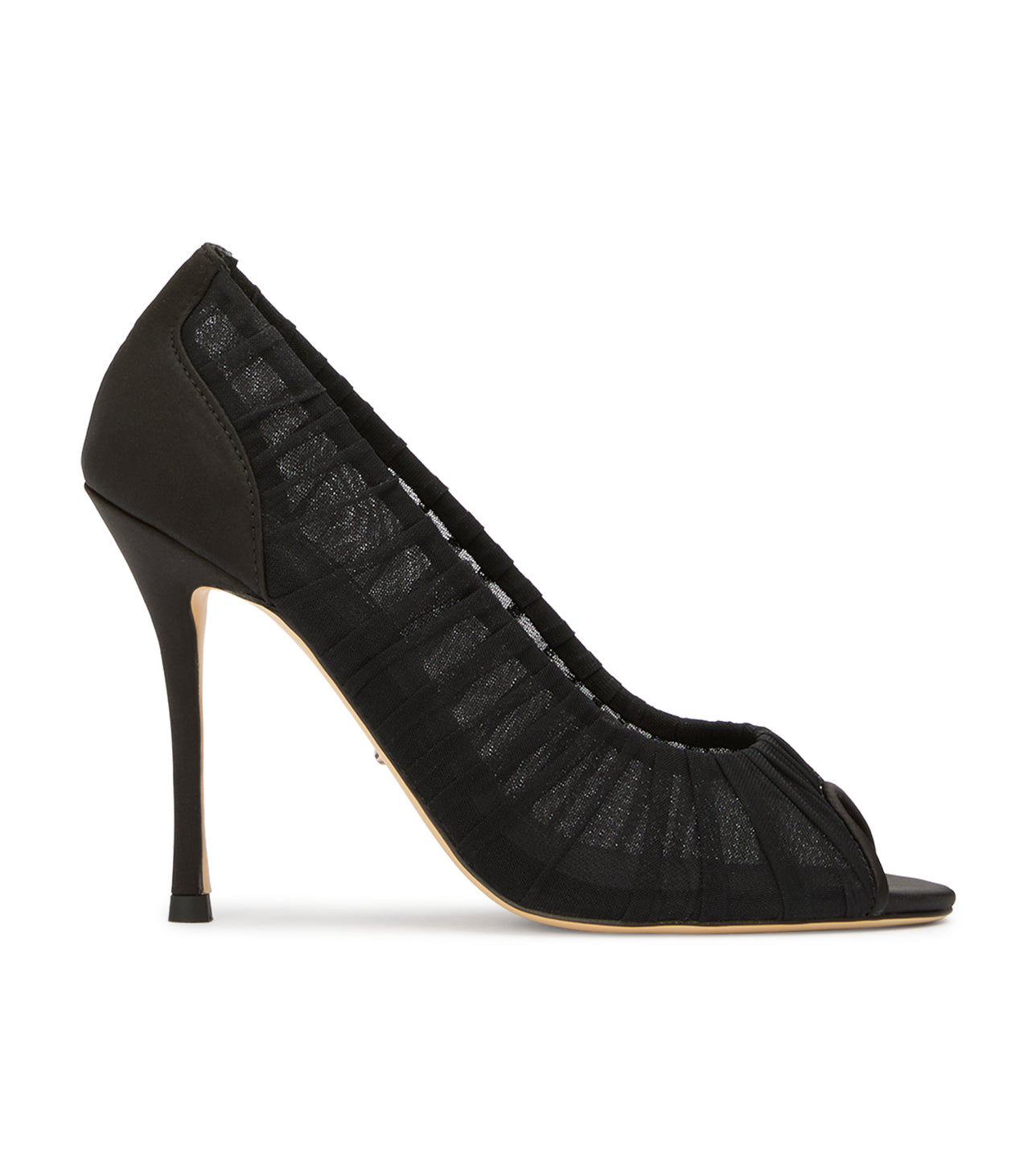 Step into elevated elegance with Silvia, a sleek black peep-toe heel featuring delicate sheer mesh detailing for a modern, high-fashion finish. Designed for evening wear and special occasions, this women’s stiletto adds effortless sophistication to any look. A statement pump perfect for event-ready styling.