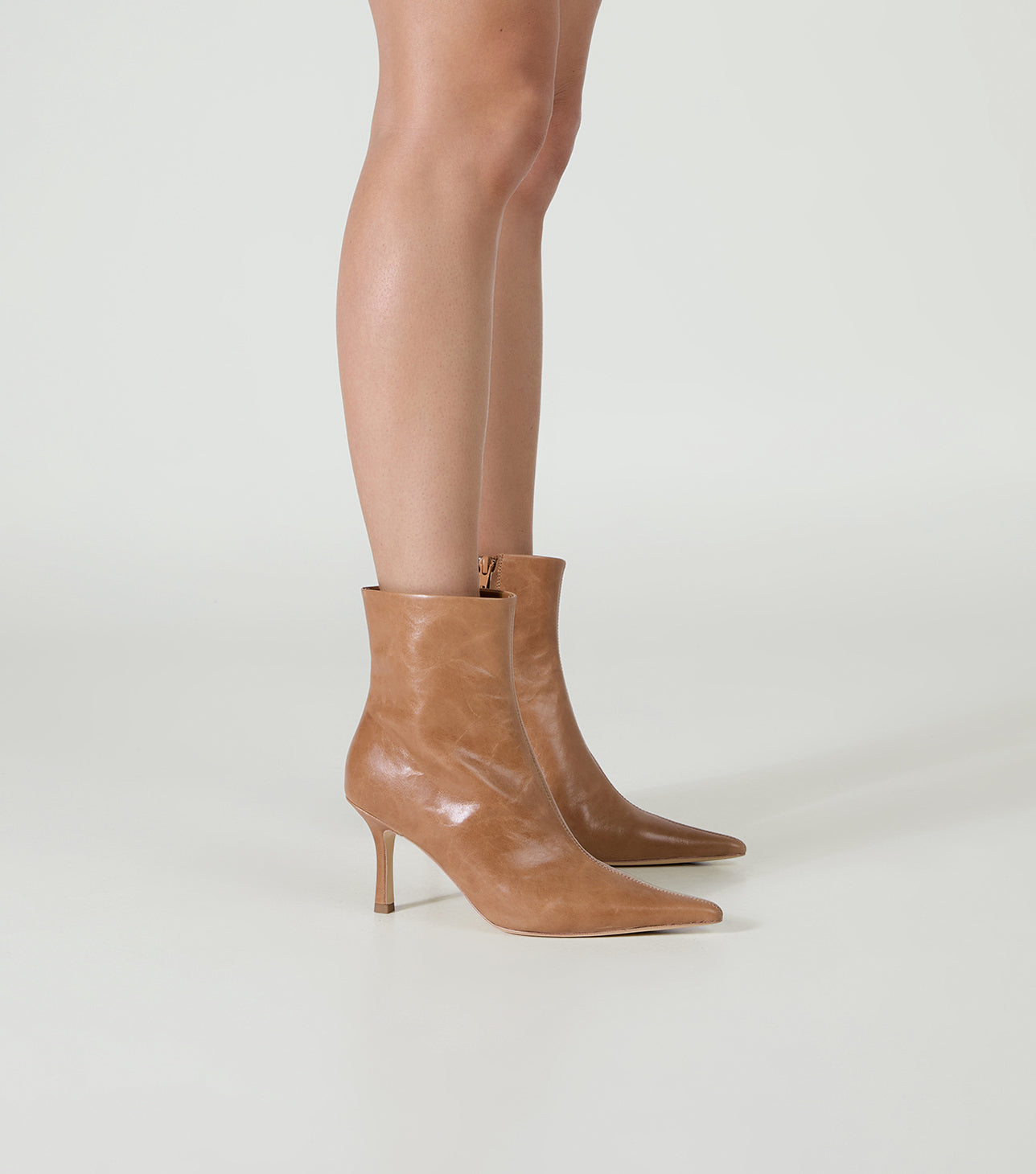 Introduce a sophisticated edge to your footwear with the Sweetie ankle boot. Crafted from smooth tan vintage leather, this boot is a must-have everyday essential, featuring a graceful ankle length, a sharp pointed toe, and a flattering slender 8cm heel. Its effortless, clean silhouette is designed to pair flawlessly with anything in your wardrobe, making it the ultimate transitional boot for elevated style.