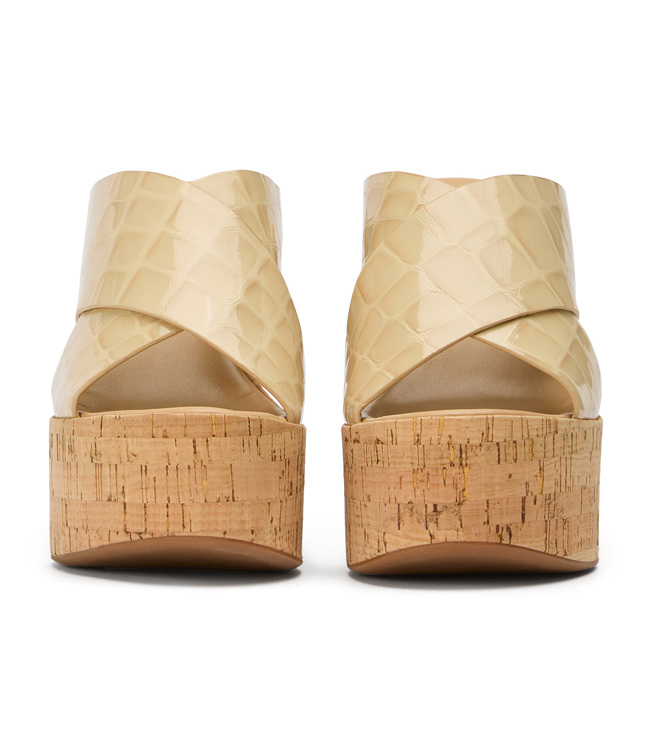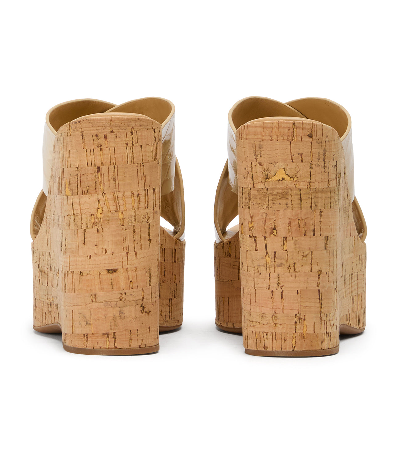 A patent leather wedge heel with open toe and crossover strap detailing, Vamore channels 2000s-era confidence with a sculpted lift and clean lines. Designed to elevate any look with ease.