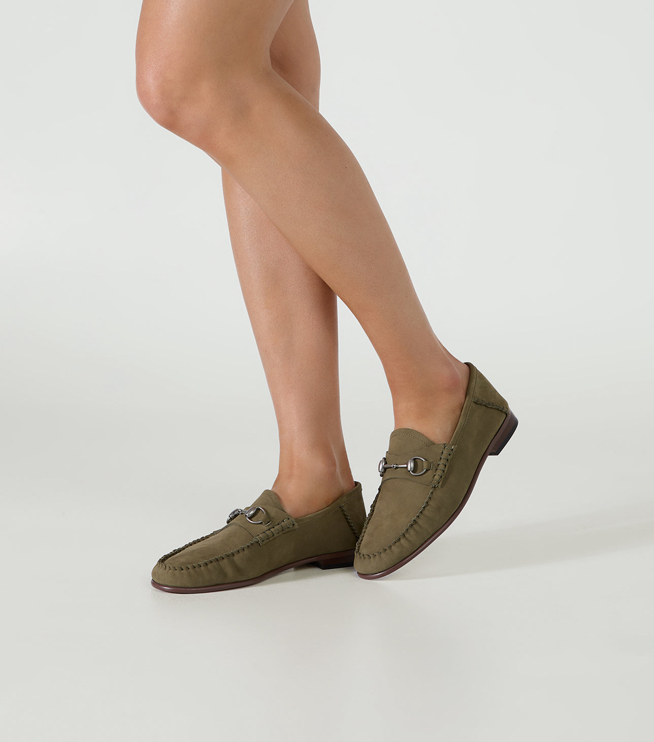 Vixen is a sleek olive green nubuck loafer accented with a refined silver hardware detail for a modern edge. Designed with a low-profile silhouette and soft finish, this women’s loafer delivers effortless sophistication for everyday wear. Perfect for workwear, smart-casual styling, and elevated off-duty looks.